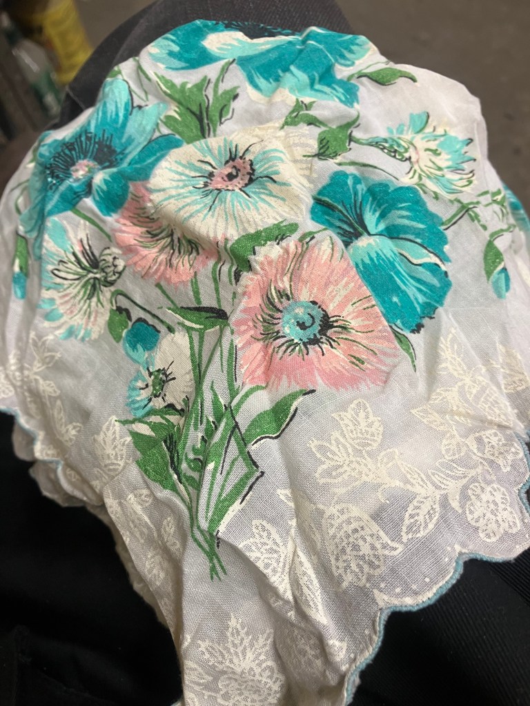 Last year, I was cleaning my unit and I came across the box. Unfortunately, it was beginning to get damaged. I pulled everything and washed it all, I didn’t realize how old some of the hankies were. Some didn’t fare well. But I realized with the ones that could be used for the traditional purpose. I decided to go ‘green’ and start carrying one in my jean’s pocket every day. Not sure how old this one is, but I suspect it’s from the 50s, 60s.