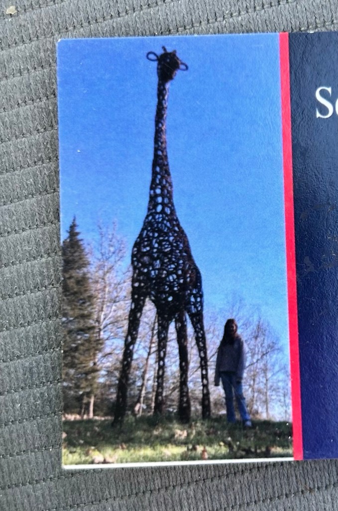 I enjoy ‘out of the box’ thinkers! Those who set themselves into the Creator’s stream of thinking and come up with art. Look at the pyramids, the Eiffel Tower, Sistine Chapel and on. These folks went with their gut and created amazing things. Most recently on my travels there is a man who creates art out of used horse shoes. His latest creation was a giraffe. He said it took him 2000 horse shoes to complete it. Well it was moved, so I thought someone purchased it. No, it was displayed with another and a baby in this field. It looked something you would see on safari…. a giraffe family Absolutely magnificent!!